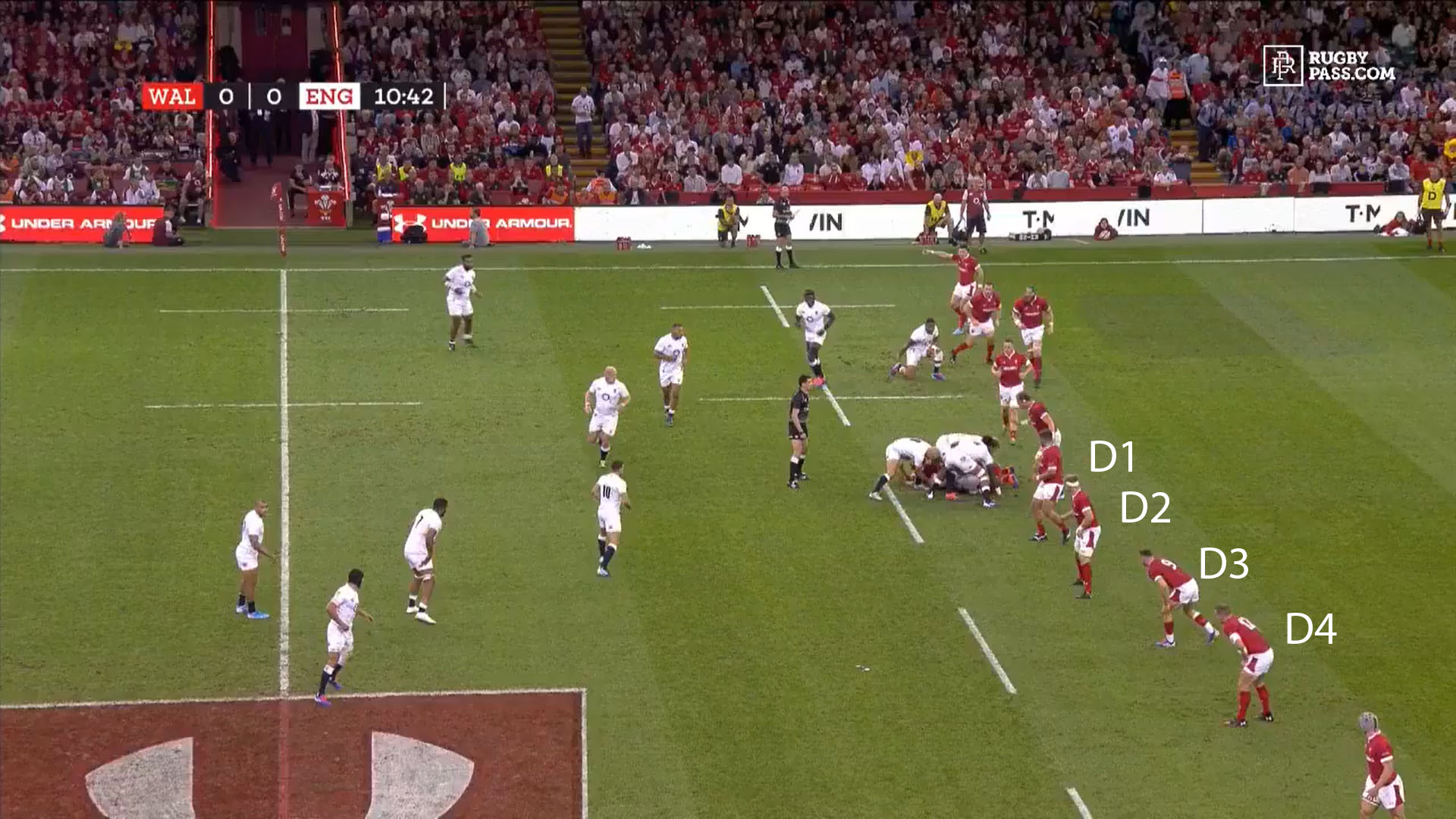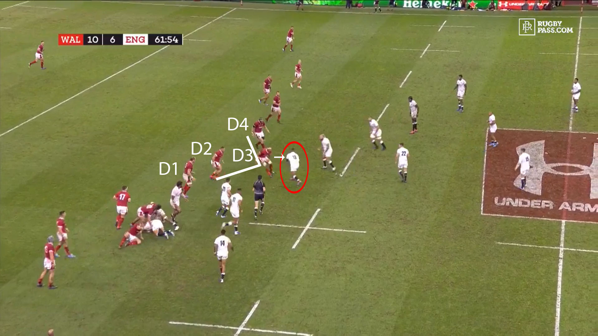 Like clockwork, D3 lays the trap by pressurising Kyle Sinckler-circled-to pass. D4 again makes the covering tackle and Wales, with Alun Wyn Jones at D1 as the inside defender this time, win the turnover from England’s Joe Marler.