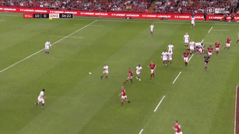 Francis beats Davies on the inside and Owens at D2 is forced to scramble, showing great pace to make a covering tackle while being assisted by D4. George North at D4 can then go for the turnover because he is an assist tackler and manages to win the ball back for Wales. While the ball goes back for a penalty advantage to England, Wales are again using the Spear Tip defence as a weapon to ensnare attackers and win the ball back.