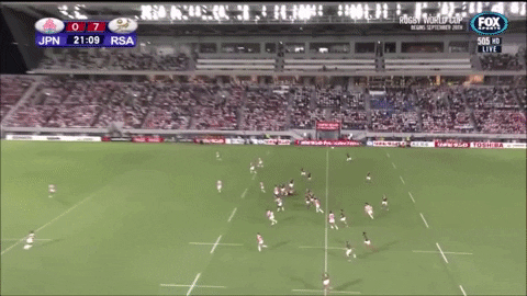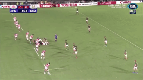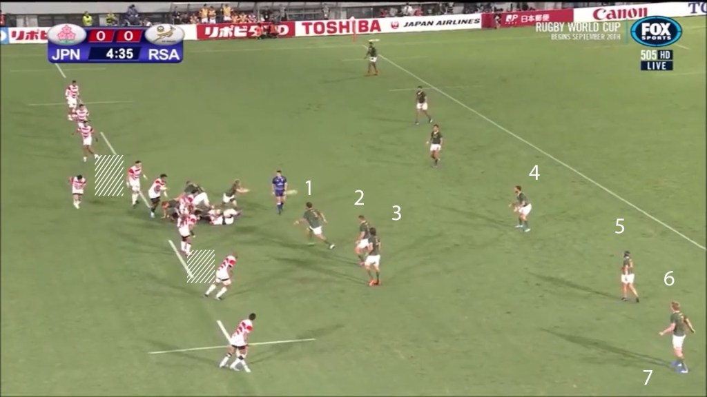 South Africa would constantly move the ball into midfield during the game before kicking. This is because having a midfield ruck draws up the Japanese defence’s wingers into the front-line of defence and leaves space in the back-field to kick into.