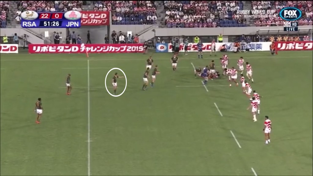 As we can see above there are large gaps appearing either side of Japan’s defence. With another Springbok winger out of shot creating a 7 vs. 4 on the left, it’s a prime opportunity to run the ball. However, South Africa take a less orthodox approach.