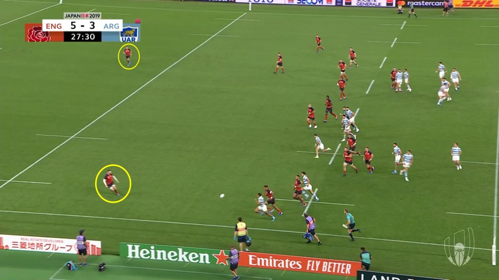 Secondly, the English defence also always have a player covering either wing for kicks; forcing the opposition to usually kick down the middle where it is advantageous for England on the counter-attack.
