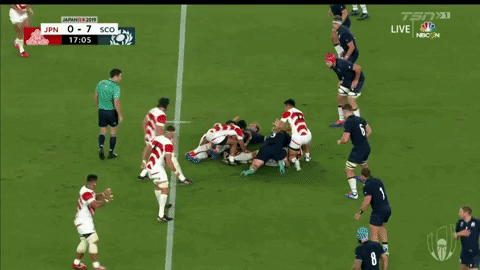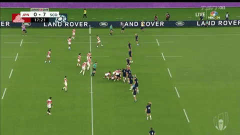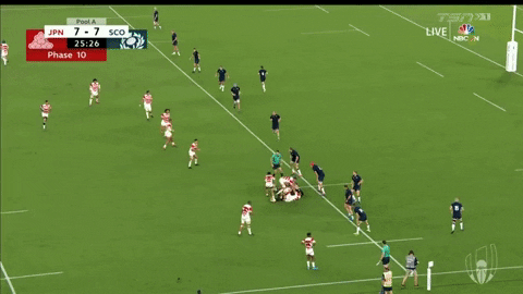 With the pod of 3 forwards already showing examples of (a) being used as a decoy to be passed behind (b) using a linking loop pass themselves and (c) carrying straight up into the defence, Japan show another attacking option for their third try against the Scottish.