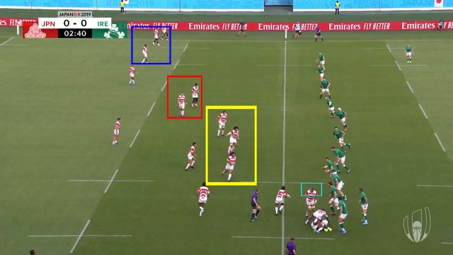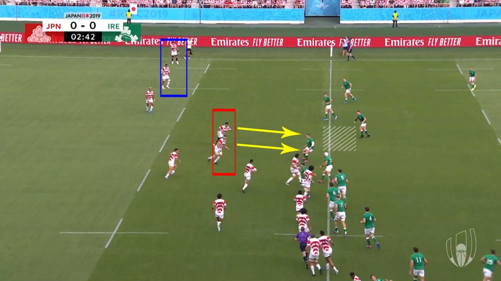 Instead of running straight and allowing the Irish defence to drift out wide, both players angle inwards slightly. This is done so that, even if they are tackled or skipped, it still preserves the space for the 2 fastest Japanese forwards on the left wing-marked in the blue box above. Moreover, these ‘unders’ lines unbalance the Irish defensive numbers on either side of the pitch. Japan eventually win a penalty in this instance, showing the value of the 1-3-2-2 early in that Ireland game.
