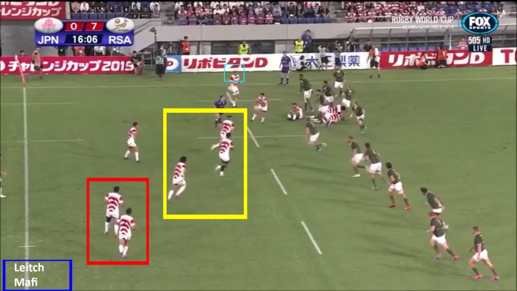 Having committed the South African defence to focusing on one side of the pitch, Japan again use the first pod of 3 forwards as decoys, but this time, they also use the first pod of 2 forwards as a decoy too. Their angled runs draw in the Springbok rush defence and releases the final group of Japan’s fastest two forwards out wide in Amanaki Mafi and Michael Leitch.