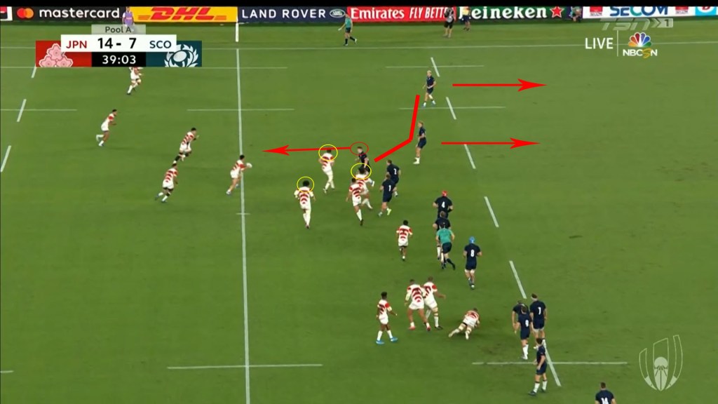 The runs of the pod of 3, plus the timing of Tamura’s tunnel pass, leaves Scotland’s Magnus Bradbury in no-mans land having over-committed to coming forward in defence. As the picture above shows, this disconnect forces also Scotland’s Chris Harris and Darcy Graham to back peddle and give Japan’s edge-attack time to make a decision.