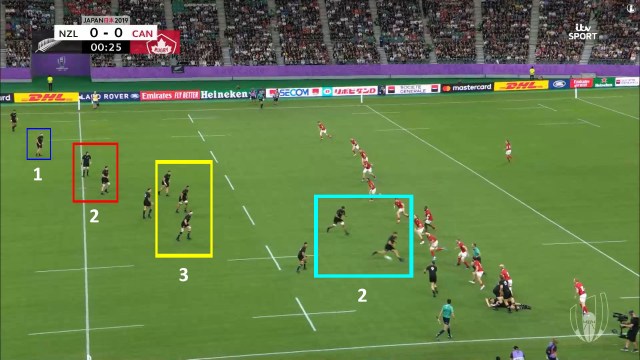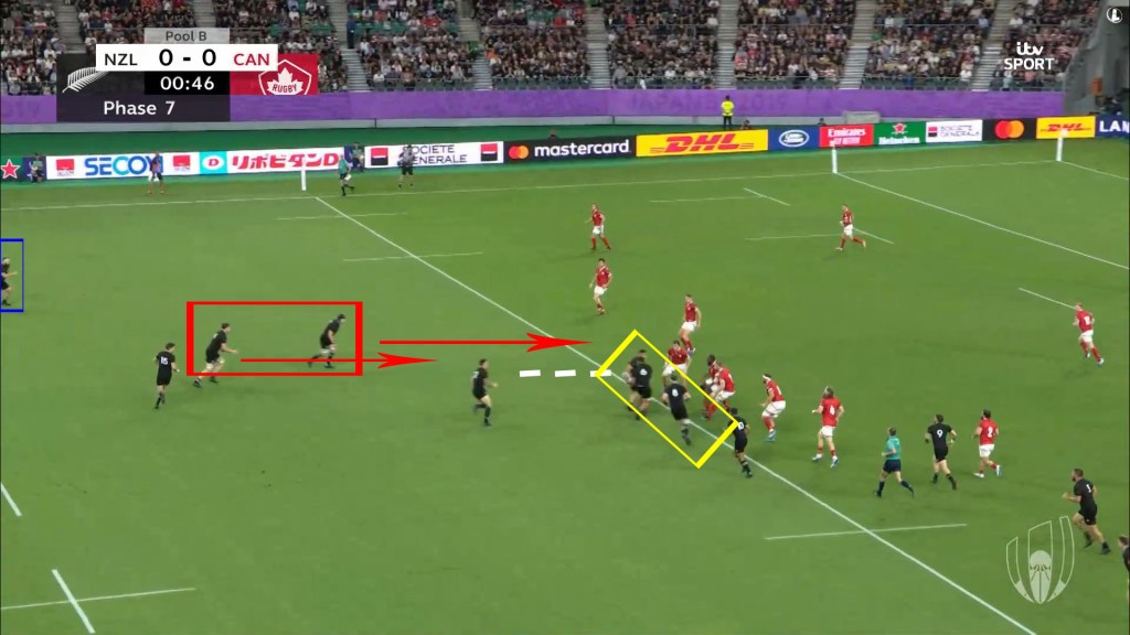 It’s important to note the running lines of the second pod of 2 here too. If we look at the image above, we can see that this group intentionally angle their runs inwards rather than running straight. While there’s an obvious gap to attack here, in a situation where there is no gap, Matt Todd’s angled run stops the Canadian defence from drifting out to defend the wing. This then preserves the space for another potential attack out wide where the last forward is with New Zealand’s fastest backs.