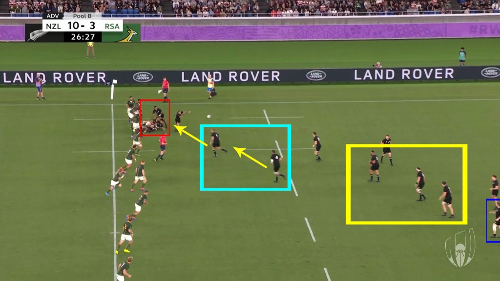 Again, we can see the 2-2-3-1 in action during New Zealand’s pivotal Pool B clash against South Africa. Sam Cane and Ardie Savea have secured the wide ruck and the other pods have formed up outside them. Aaron Smith passes behind the double decoy and Beauden Barrett takes the ball into contact where he is supported by the 3 forwards in the yellow pod.