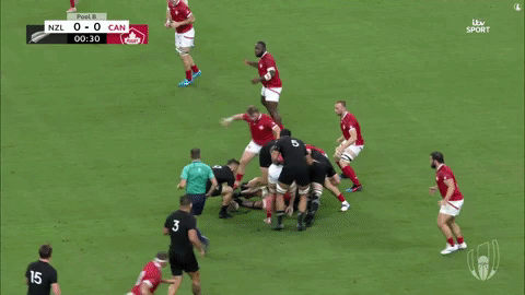 As we see above, the first pod of 2 forwards run an angled double decoy line that staggers Canada’s defensive line. Using these two forwards as dummy runners also buys Richie Mo’unga time to pass to the pod of 3 forwards in midfield. While the pod of 3 don’t make any great progress up the field, the All Blacks have now split the Canada defence and can pick which side is weakest to attack.