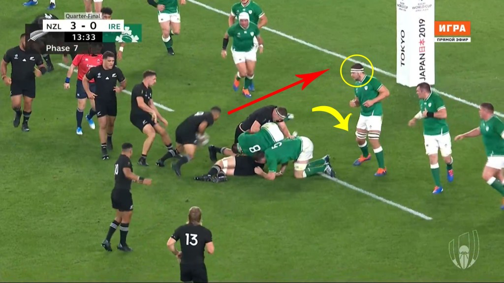However, New Zealand take advantage of Ireland over-committing. Iain Henderson – circled in yellow – over-folds to the left side of the ruck, the gap opens up and Rory Best can’t win the race for space to stop Smith.