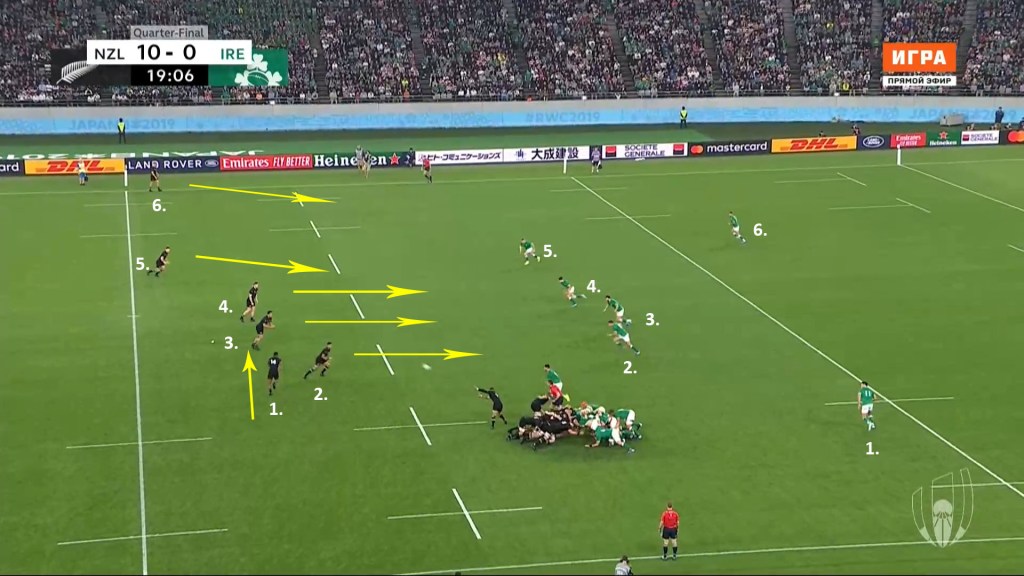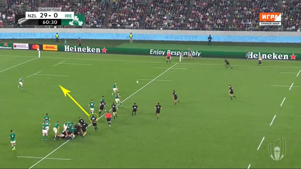 As we can see in the clip above, New Zealand use a series of pick-and-go’s with the forwards; running primarily at the space between Ireland’s first and second defenders at each ruck. A series of long-arm placements by the tackled players also allows the ball to be recycled quickly.