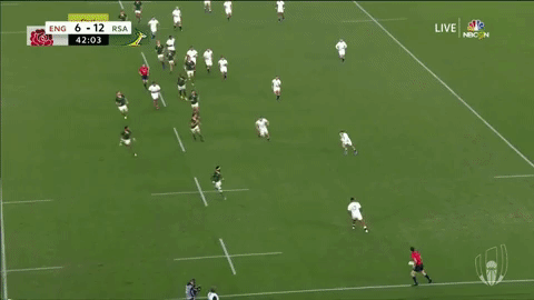 Although England are now further up the field, Am’s original width and covering tackle aids South Africa in getting back into their 13-2 structure while blitzing the clearing kick that follows.