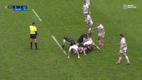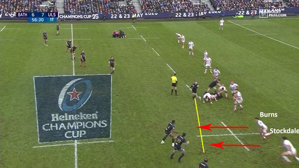 Although Bath do get over the gain-line marked in yellow in the still image above, they have to work hard for it with an offload. In the grand scheme of things, a loss of 2 metres isn’t a bad return for Ulster in a potential 6 vs. 5 situation and the defence is able to comfortably reset for the next phase.