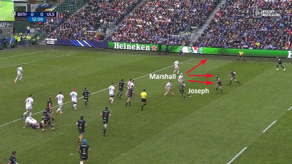 Once Joseph does bounce out in attack with Priestland, Ulster wedge across as Stuart McCloskey and Marshall do a great job of pressuring the pass again.
