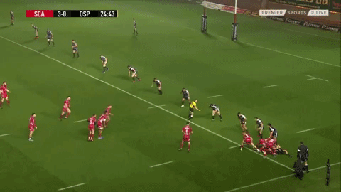 Although passing the ball is the Scarlets’ most frequent mode of transporting the ball to the wing, sometimes a cross-field kick is just a quicker way to get around a rush defence. In this game against Zebre in October, the Welsh region would end up scoring two tries using this same kick-pass approach to beat the blitz.