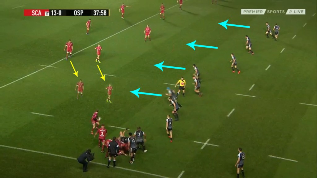 Whereas many teams will use first carry in the clip above to set up a ruck and get back into a 1-3-3-1 structure, the Scarlets have shown a different approach.